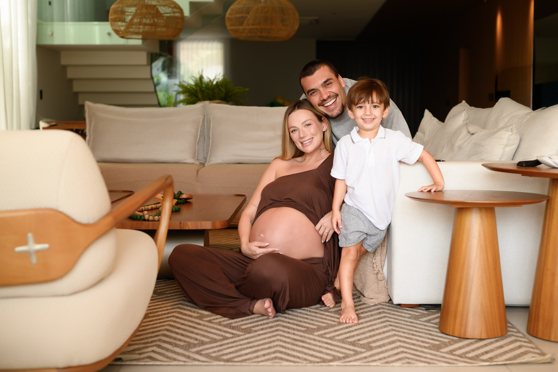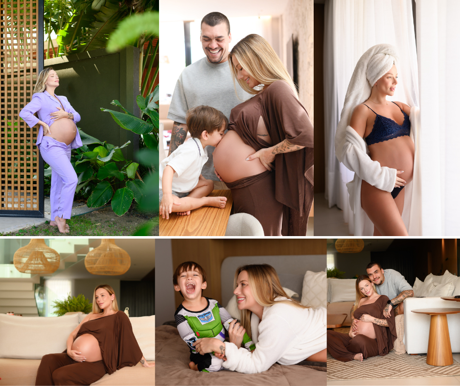 Uma ideia legal é fazer com algumas semanas de diferença e registrar dois momentos da gestação. Marcaremos um dia para o ensaio em casa e outro para o Estúdio.