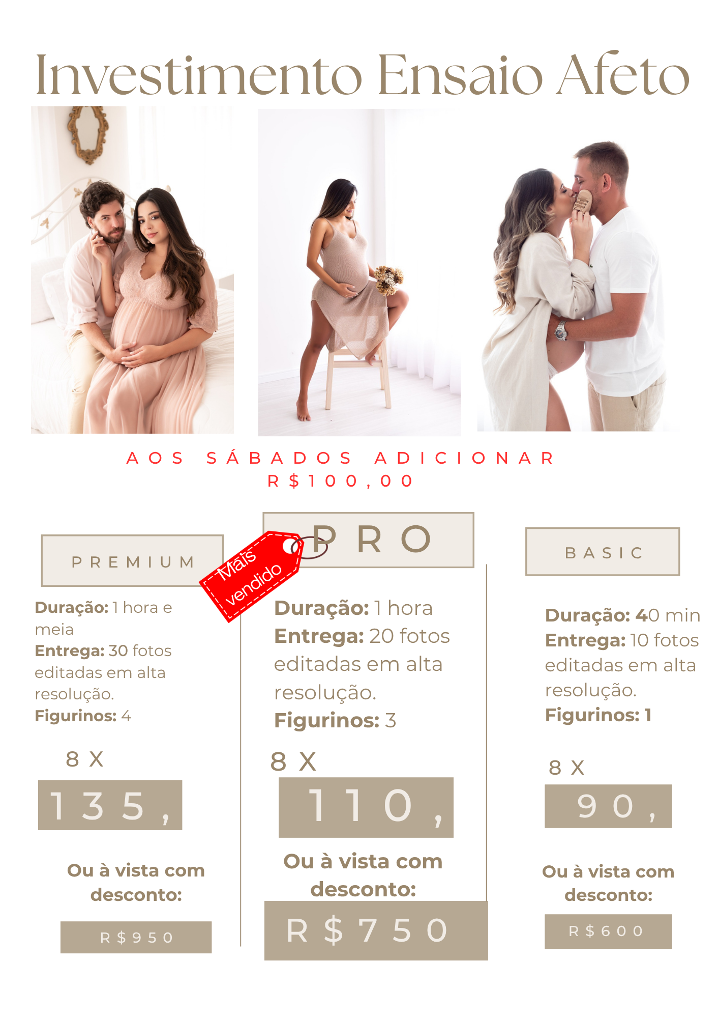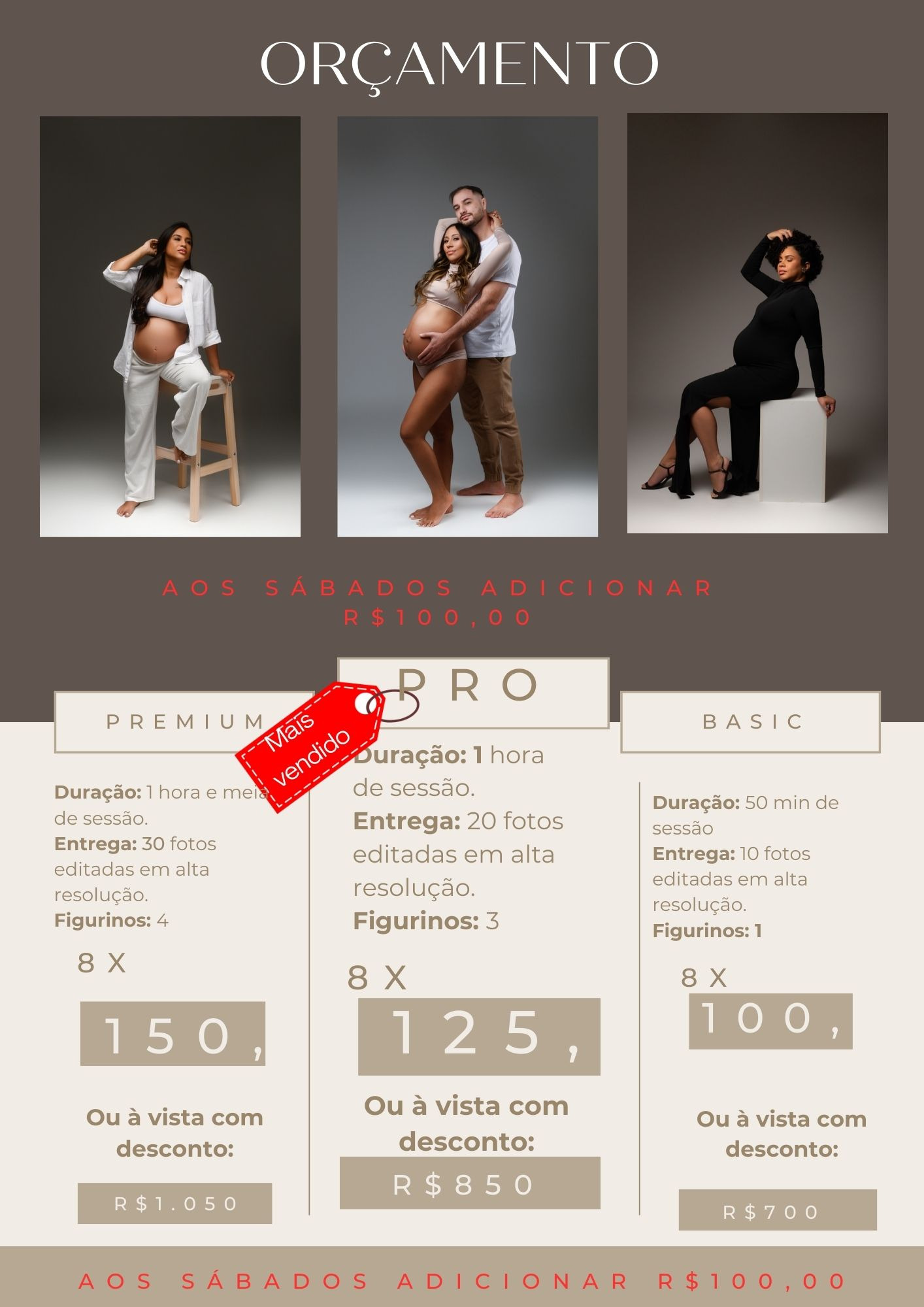 *Pagamento à vista, com desconto: 30% no ato do contrato e o restante em até uma semana antes do ensaio ou o valor total por pix, no ato do contrato.
