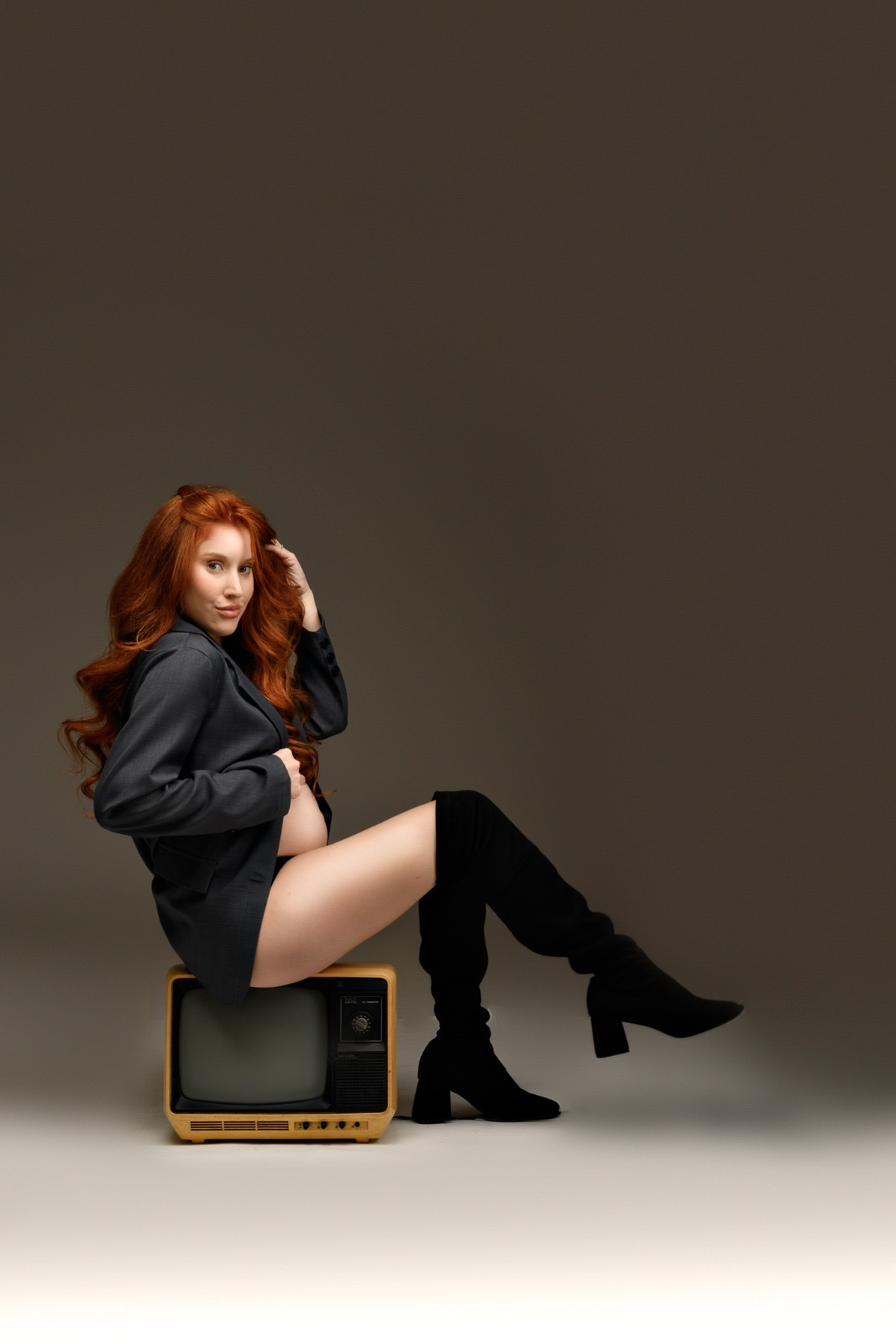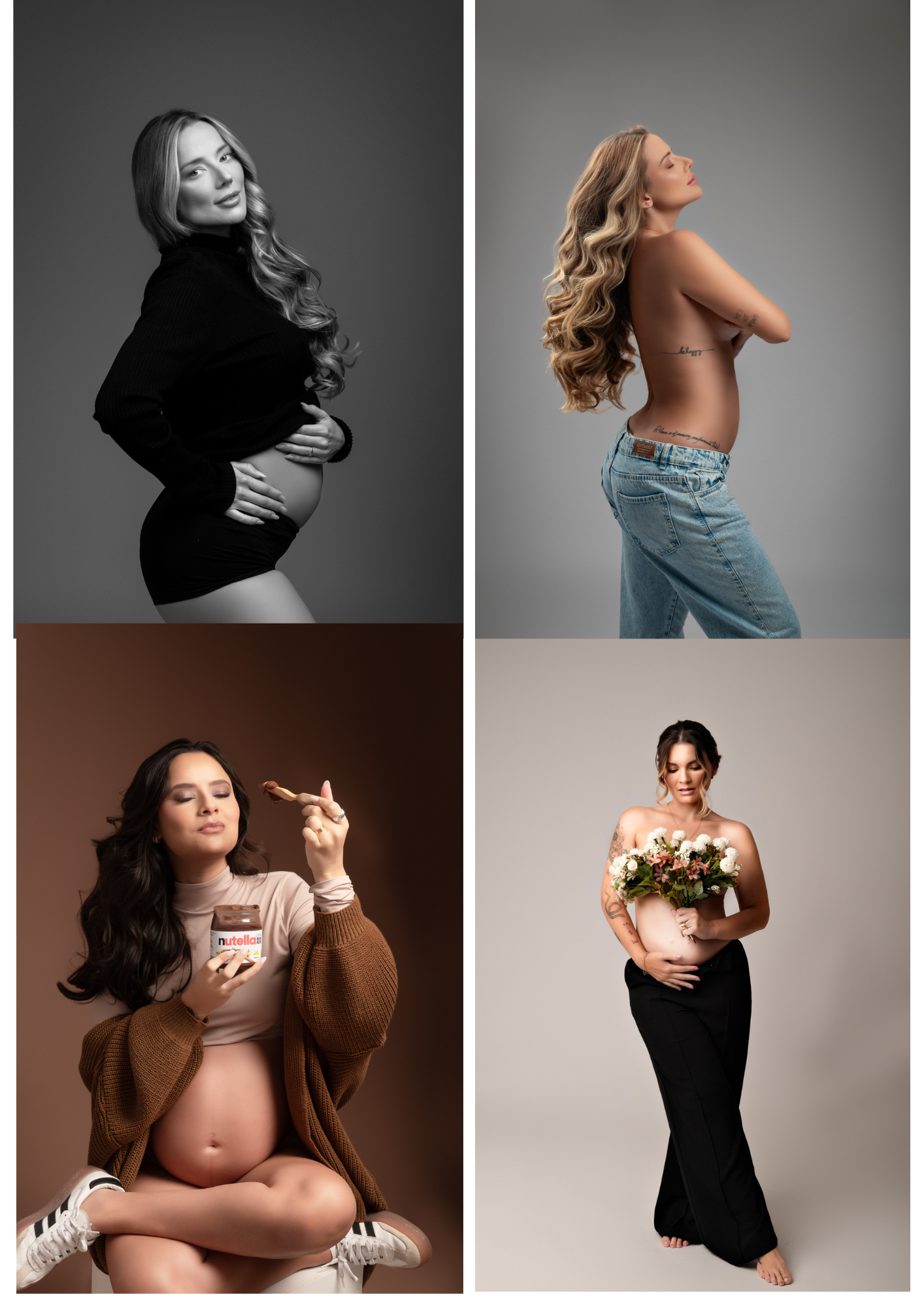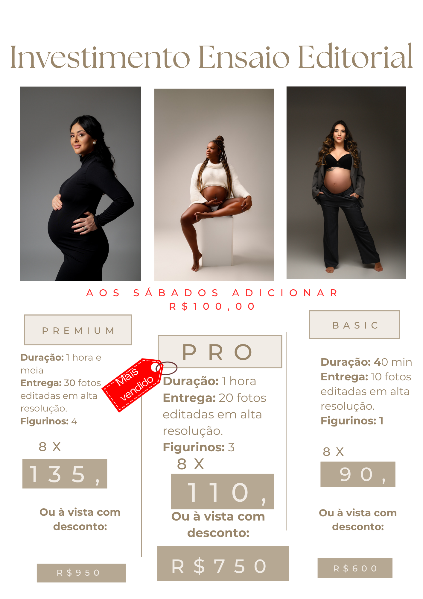 O Ensaio Editorial é intensidade e presença. Com fundo mais escuro e iluminação em flash, ele cria imagens marcantes e sofisticadas. Aqui, o foco são retratos mais fortes, com expressão, atitude e aquele “carão” que transforma a gestante em protagonista. Os figurinos seguem uma linha mais fashionista, inspirados em editoriais de moda, com peças diferenciadas que fogem do óbvio. É o ensaio ideal para quem quer algo impactante — perfeito para a mãe ou para fotos com o pai.