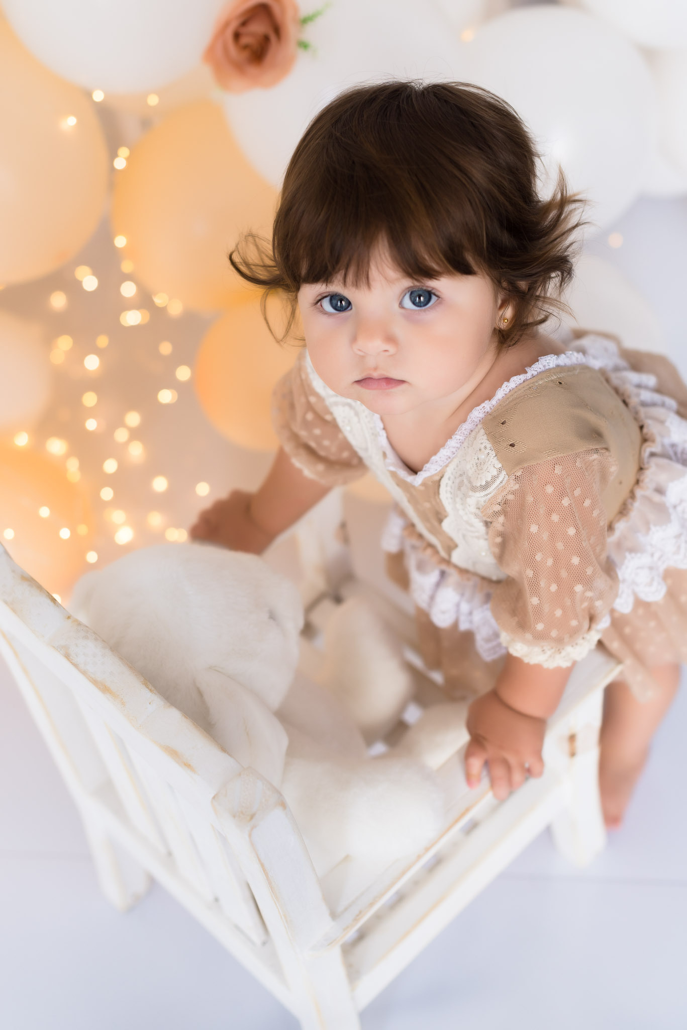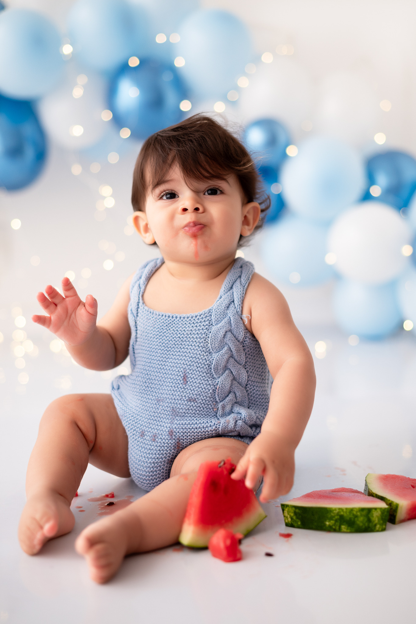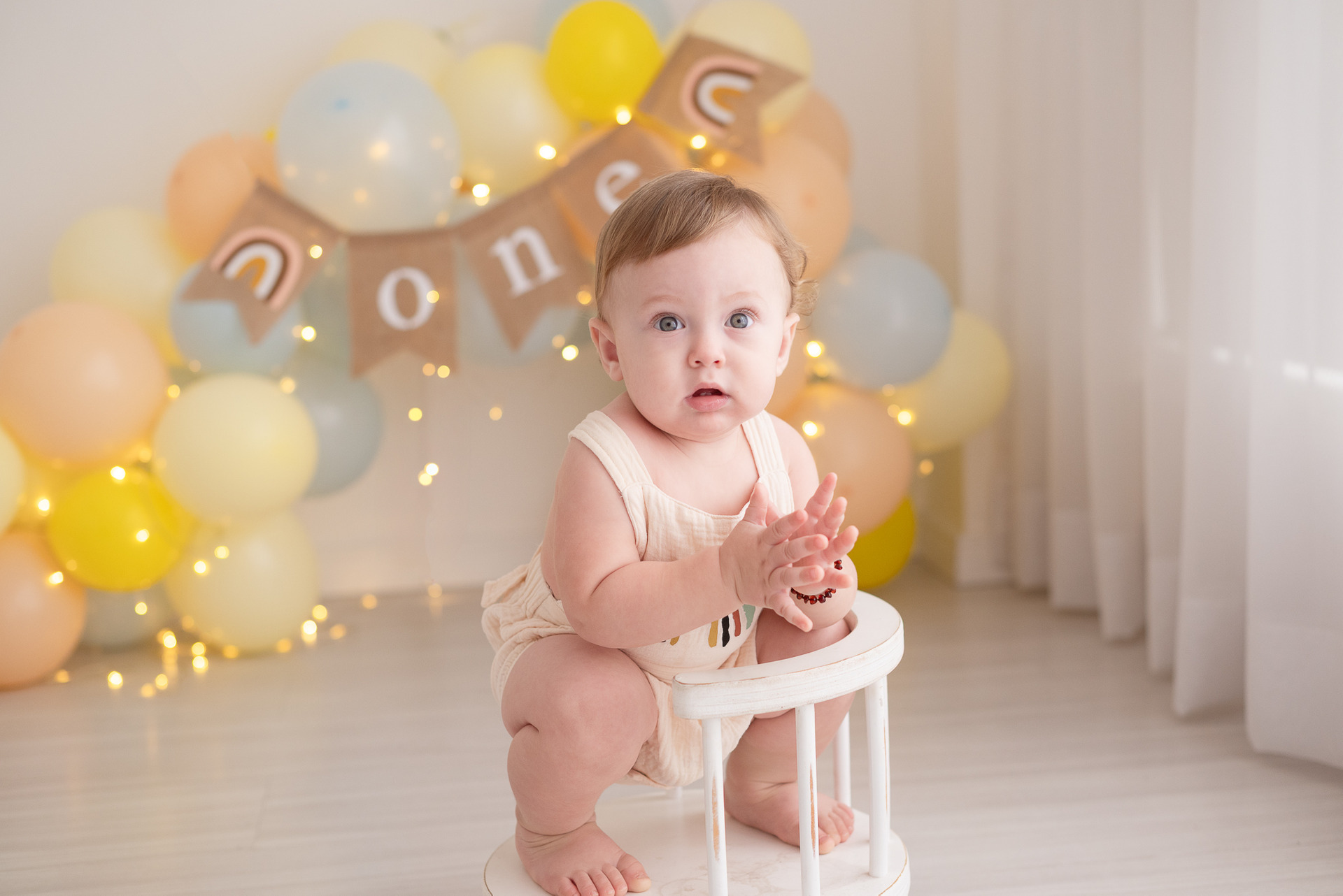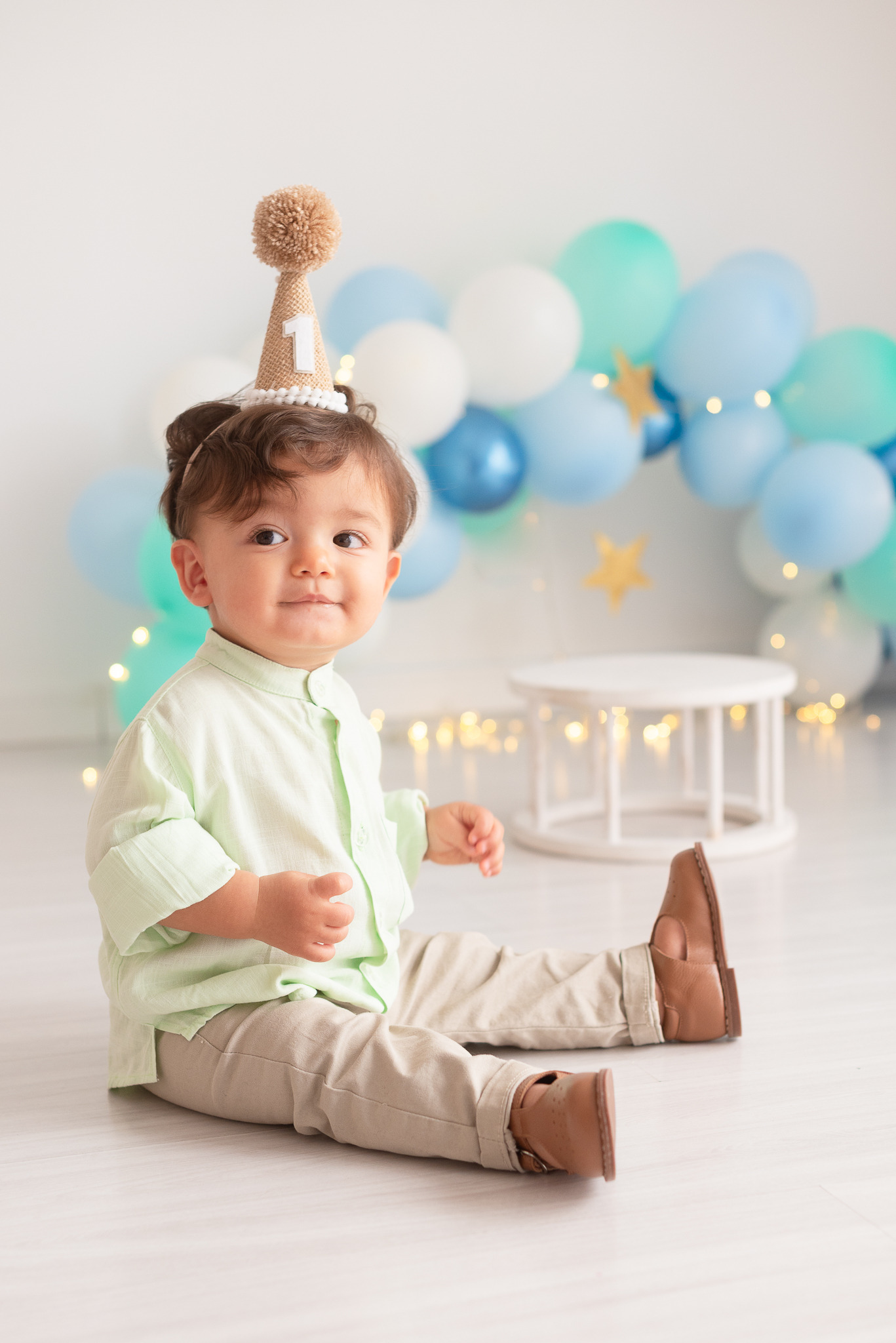 Nosso estilo é clean, não usamos cenários, usamos um arco de bolas cintilantes que dão o ar de festa nas fotos sem a poluição de muitos adereços, o objetivo é fazer o aniversariante brilhar!