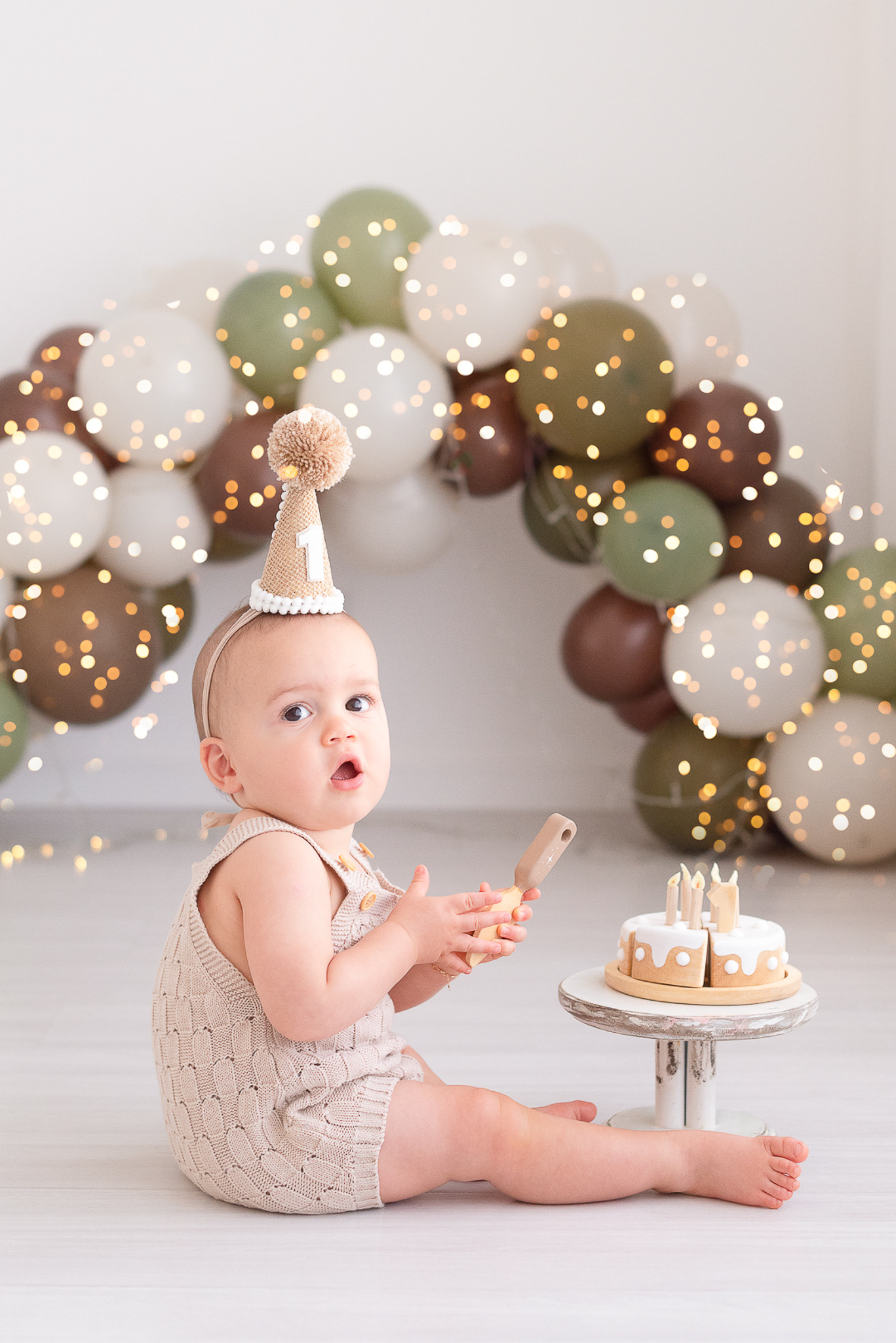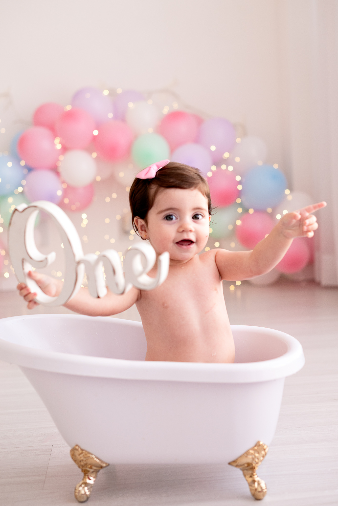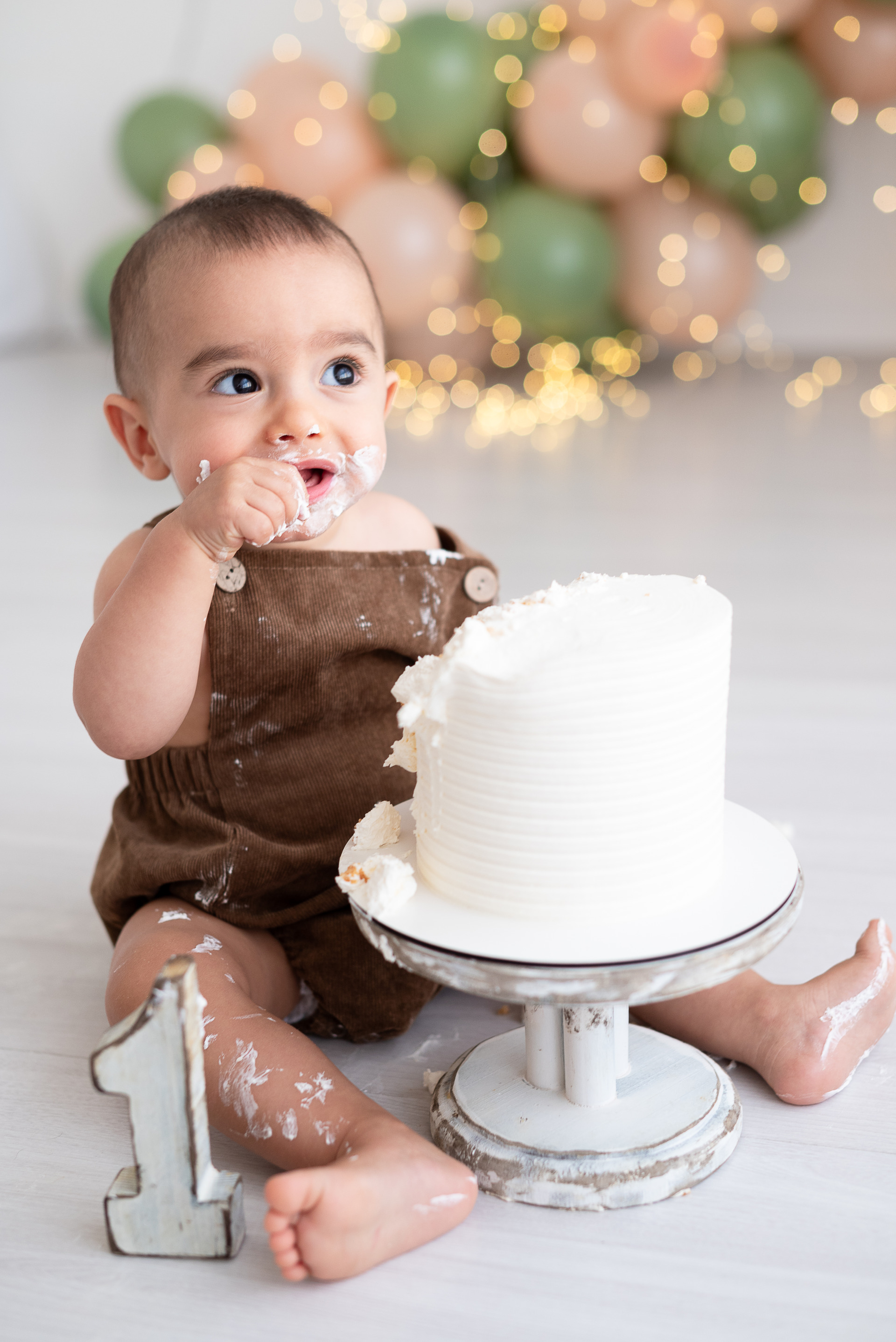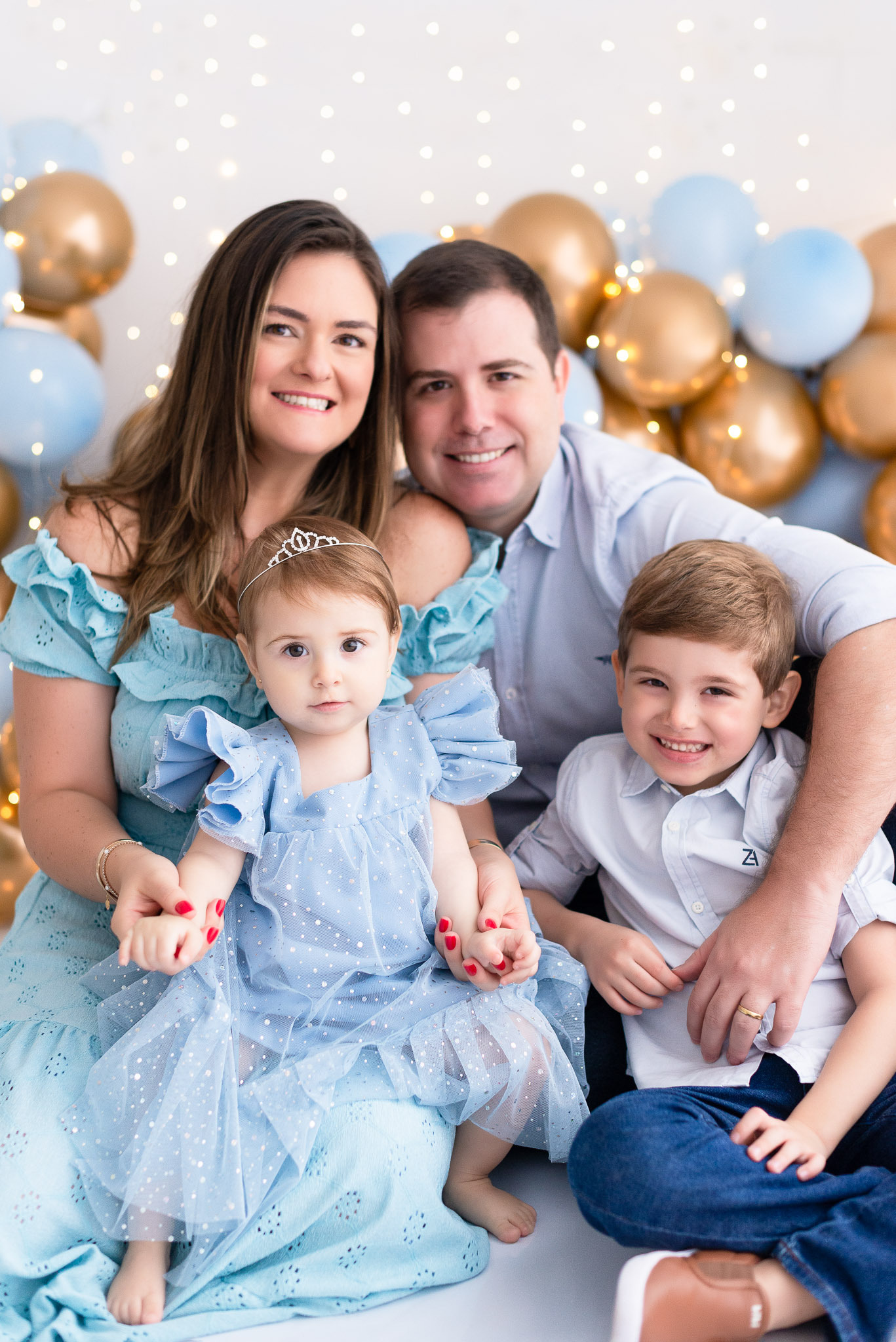 Nosso estilo é clean, não usamos cenários, usamos um arco de bolas cintilantes que dão o ar de festa nas fotos sem a poluição de muitos adereços, o objetivo é fazer o aniversariante brilhar!